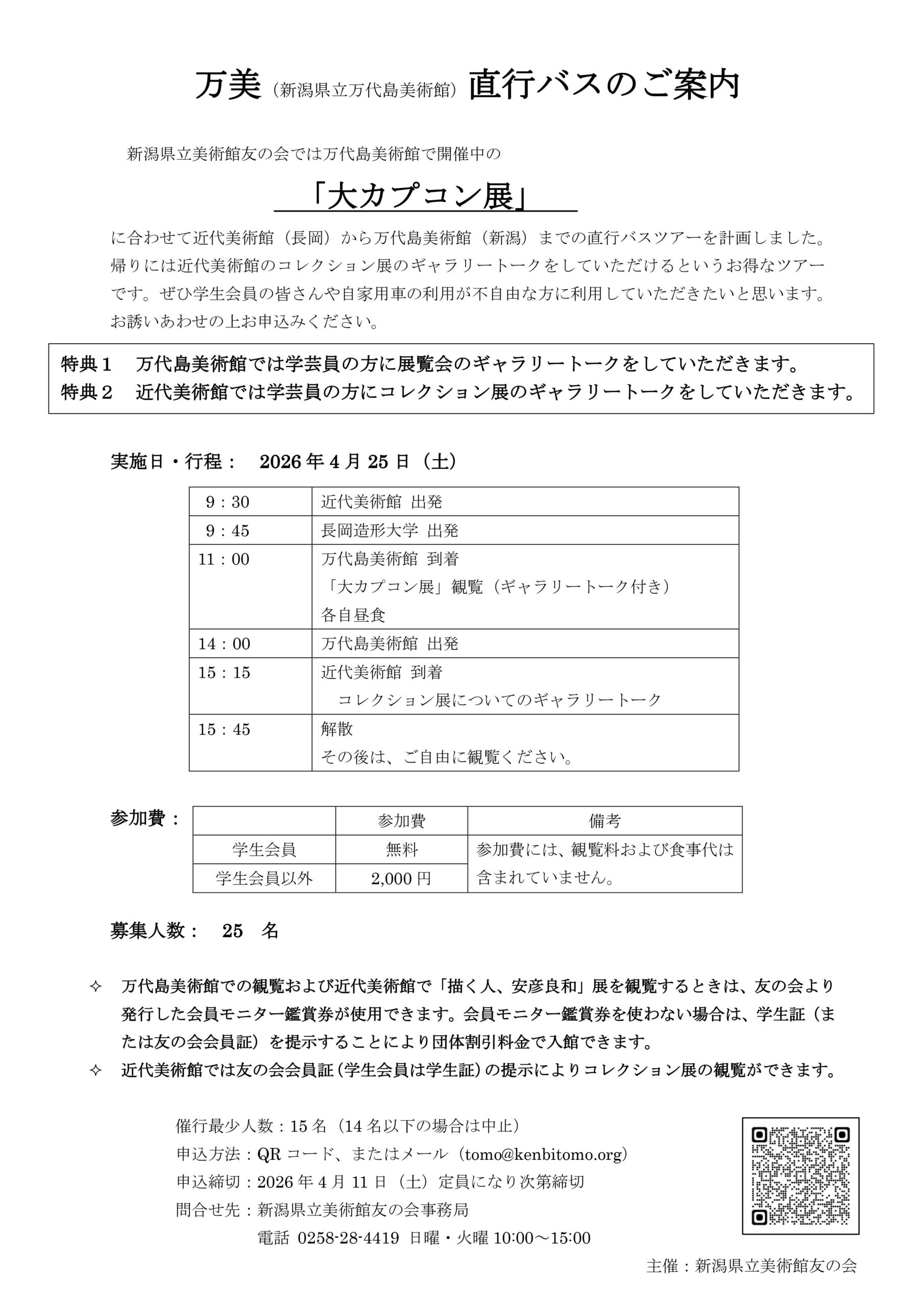 新潟県立美術館友の会では万代島美術館で開催中の「 大カプコン展 」に合わせて近代美術館(長岡)から万代島美術館(新潟)までの直行バスツアーを計画しました。帰りには近代美術館のギャラリートークをしていただけるというお得なツアーです。ぜひ学生会員の皆さんや自家用車の利用が不自由な方に利用していただきたいと思います。お誘いあわせの上お申込みください。